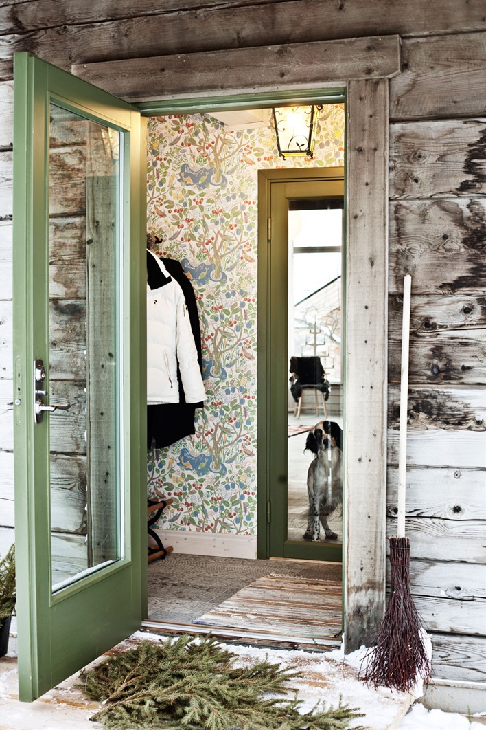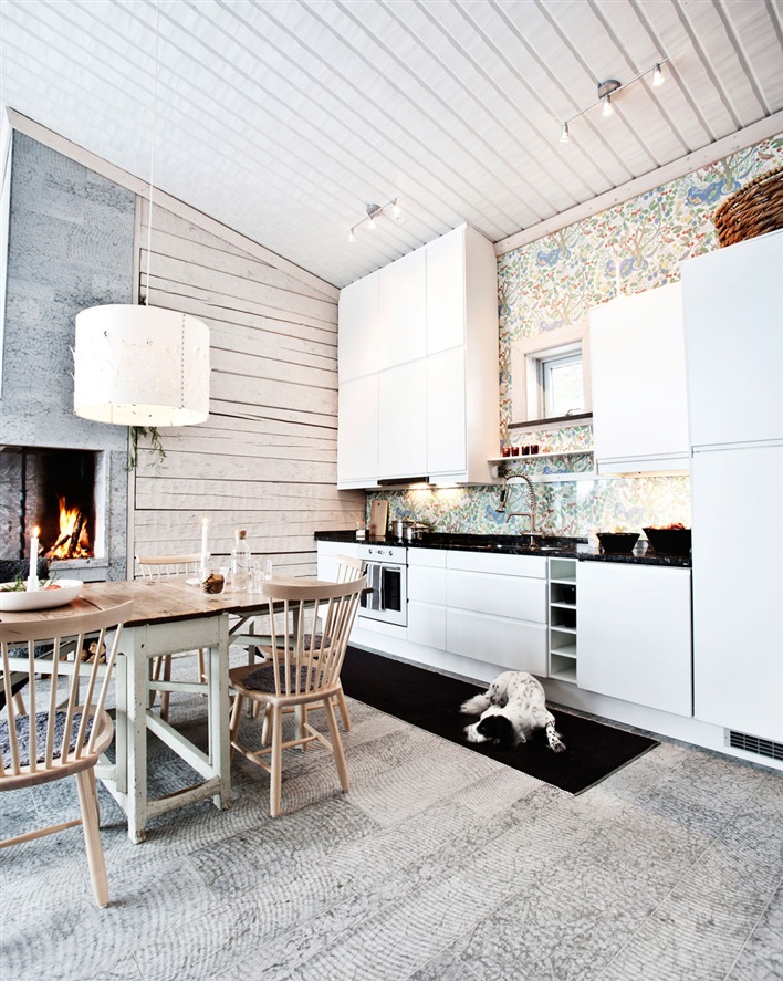 wooden house with big windows, wooden cozy furnitures and a beautiful fireplace,that stands out from the surrounding houses by its modern